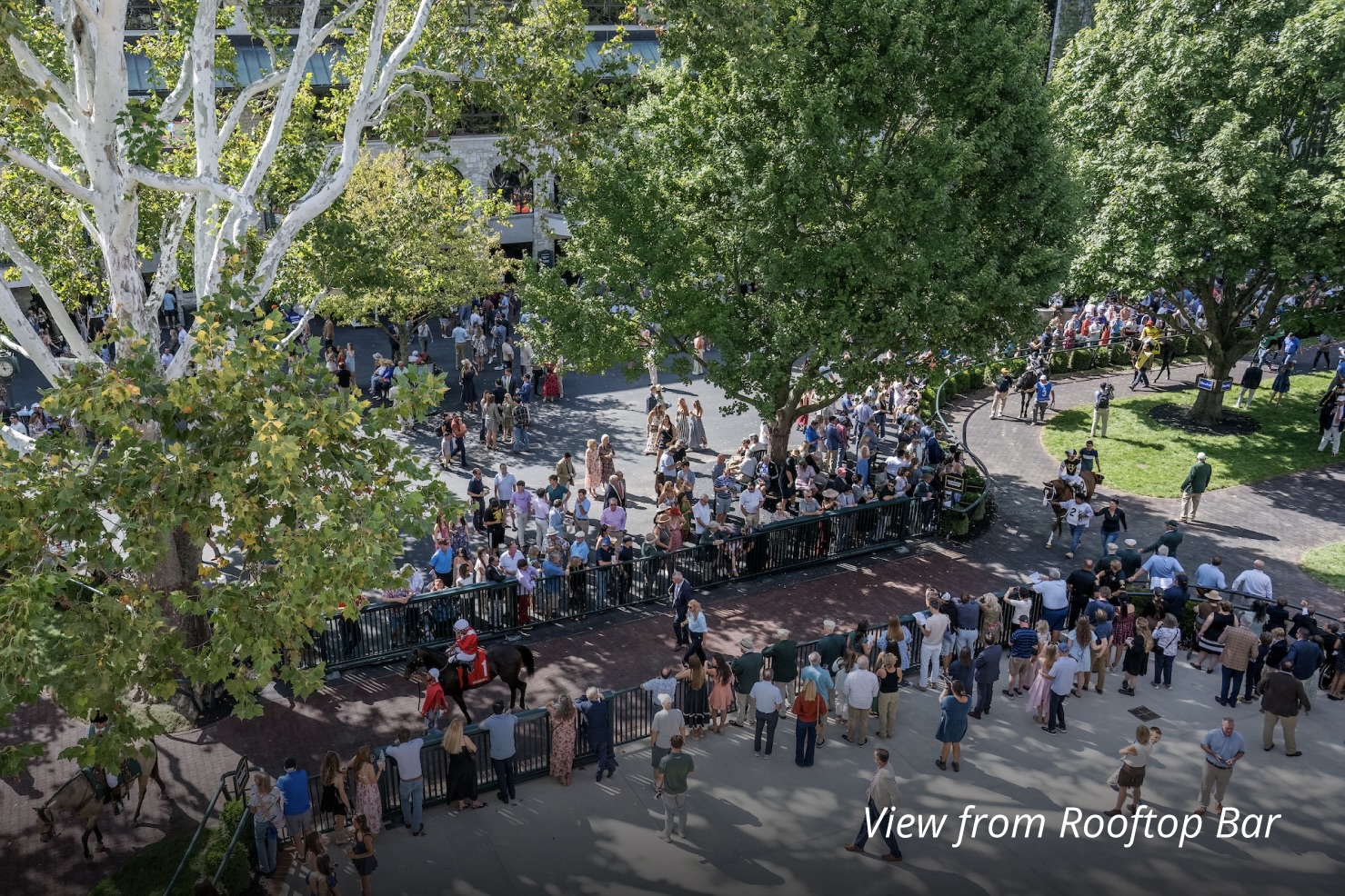 The Rooftop bar area, located on the third floor of the Paddock Building, is a covered outdoor area for guests to enjoy on race days. Featuring a large oval bar, the Rooftop bar area has a full sit-down dining menu in an outdoor area with a more relaxed setting of high-top tables. Overlooking the iconic Sycamore tree, the Rooftop bar area provides a one-of-a-kind venue to enjoy both the sights and flavors of the day.