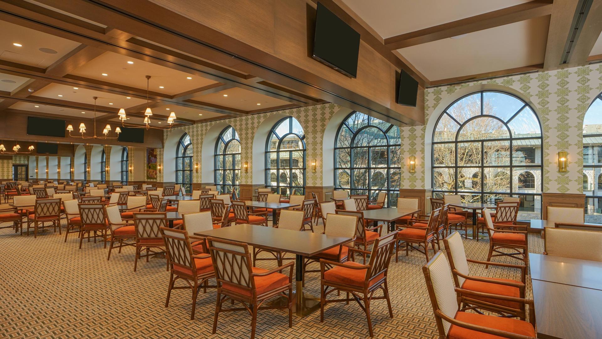Designed to blend charm and timeless elegance, the Dogwood Room is a spacious second-floor venue perfect for dining in a warm, inviting atmosphere. The space providing guests with a front-row view of Keeneland’s iconic Saddling Paddock and is well-suited for group gatherings and celebrations offering a more traditional dining experience in a refined setting.